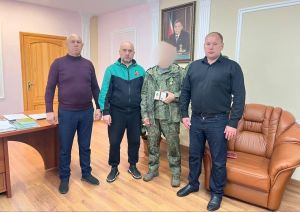 Теләче мунициапаль районы башлыгы Айрат Гыйлван Улы Фәтхуллин махсус хәрби операциядән кыска вакытлы ялга кайткан Олы Нырсы авылы егете Раушан Рәйхан улы Сафин белән очрашты.